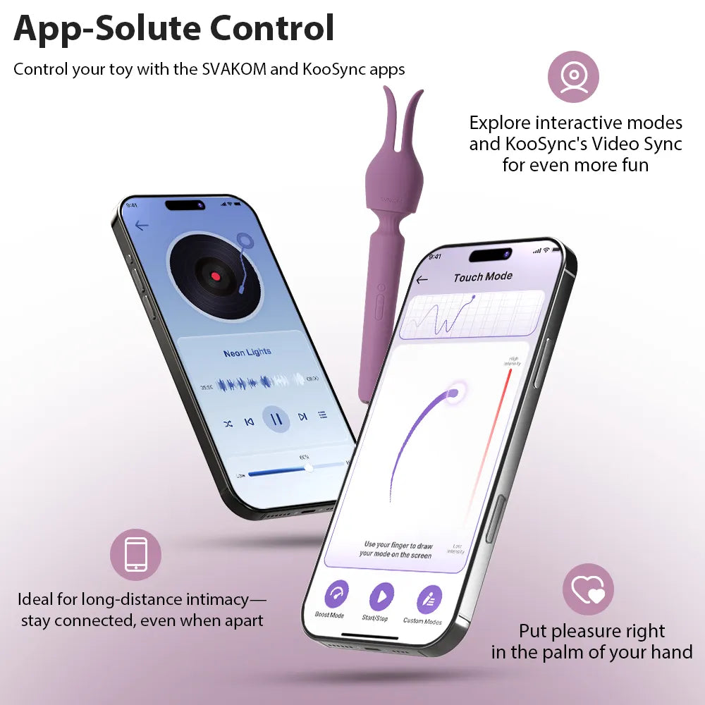 Emma Neo 2 pairs with the SVAKOM App in seconds. Access bonus preset modes, or create your own using finger drawings, music or environmental sounds. You can also text chat, video call or share control with a partner at any distance.