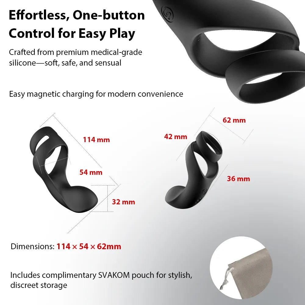 Stylish black meets stretchable pleasure. Benedict is a double ring perineum stimulator that packs quite the punch. Experience breath-taking vibrations and sublime restriction.